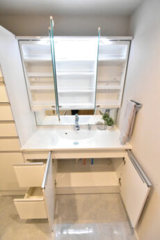 洗面室には洗面化粧台の他に、浴室とリネン棚がまとまっていて脱衣所も兼ねています。洗面化粧台には身だしなみチェックに便利な三面鏡付き。譲り合えば二人くらいなら並んで使えそうな幅も朝のラッシュ時には嬉しいですね。