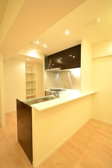 広々としたキッチンスペースには可動棚があり、電子レンジなどの家電を置くスペースと冷蔵庫のほか、キッチンカウンターなども置けそうなスペースがあります。