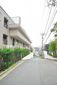ビンテージマンションならではの重厚な造りのエントランスは坂の中腹にあり、地下1階部分にあたります。