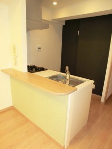 カウンタータイプでほぼ完全に独立しています。キッチン奥の濃色のアクセント