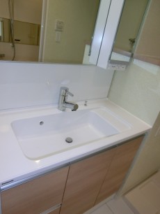 洗面化粧台は横幅が広く、のびのびした気持ちで手や顔を洗えそう。