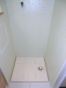洗濯機置き場には若草色・葉っぱ模様のアクセントクロスがぐるりと
