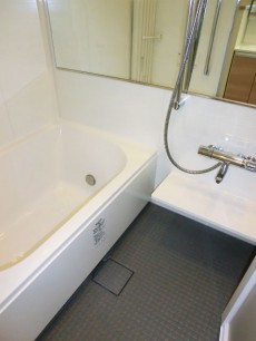 壁面のホワイトパネルが明るくクリーンなイメージのバスルーム。毎日の
