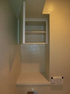 横手にはニッチスペース&上部吊戸棚があるので、生活用品は吊戸棚に