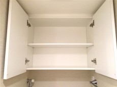 洗面台の横の壁に収納が作られています。リネンの収納に良いですね♪♪扉もしっかりついています。