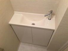 真っ白な手洗いキャビネットも設置されていて、ハイスペックなトイレです