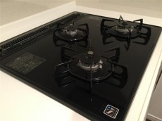 広々とした人造大理石のワークトップとシンクのキッチンです♫3つ口コンロはお料理好きの方には嬉しいですね♫