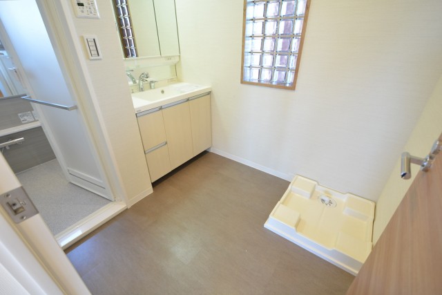 洗面室には洗濯パン、洗面台、バスルームが1室にまとまっています!