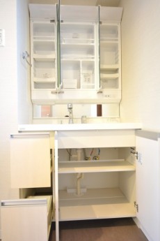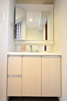 洗面化粧台は三面鏡なので、出勤前のメイクやヘアセットが時間短縮になりそう!