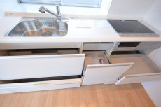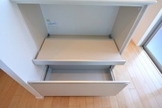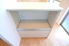 更に、システムキッチンの向かい側には、キッチンカウンターがあり、下には保管棚も付いていますので嬉しい限りです^^