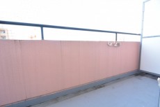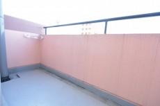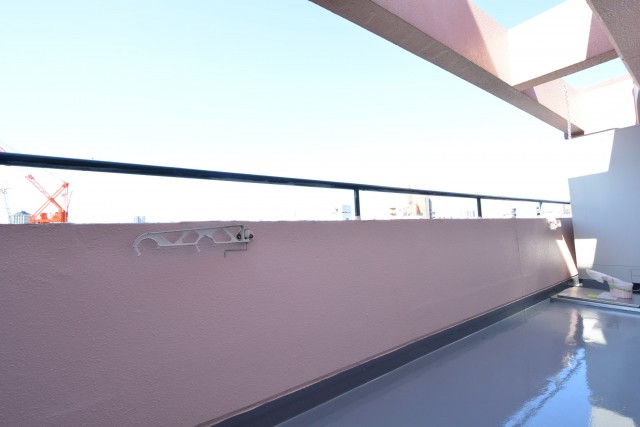 バルコニーはピンク色の手摺壁にグレーの防水塗装、空の青が絶妙ですね!
