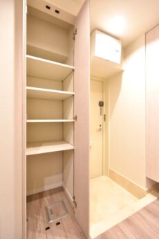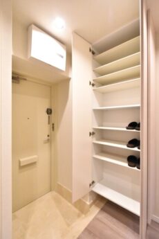 玄関の両側に収納棚とシューズボックスを設置。シューズボックスは天井までのトールタイプで収納力抜群、おひとり暮らしなら靴好きの方でも十分な大きさですね。玄関があまり広くないのでまめに片づけたいところです。