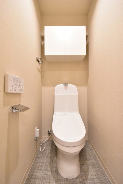 洗浄便座はTOTO製。トイレットペーパーなどのストックに便利な吊戸棚も付いています。こちらも低めに設置されていますね。