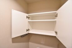 出てすぐの扉は洗濯機スペース。中には棚も付いているので洗剤などの洗濯グッズはこちらへどうぞ。地味に嬉しい照明付き。