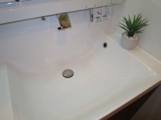 洗面化粧台もホワイトと木目調扉板の取り合わせが美しく清潔感あります。節水