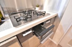 コンロは3口、グリル付き。温度設定やタイマー機能があるタイプです。最近よく見かけますが、我が家にもぜひ欲しいところです。