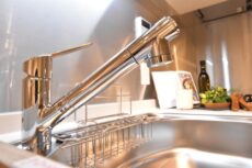 水栓は浄水器一体型水栓。気軽に美味しいお水を使えます。ただし、作り置きの麦茶や氷には向いていないとか。ノズルが伸びるのでシンクのお掃除にも便利です。