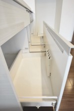 大割りのスライドストッカーには大きなフライパンや鍋もサクサク入りそうです。