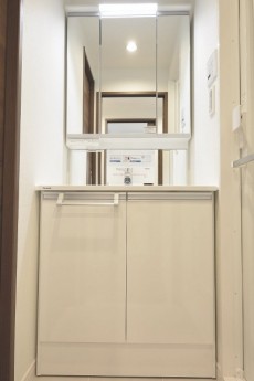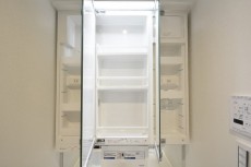 3面鏡の裏は小物が収納できるようになっているので、散らかりがちな水廻りも