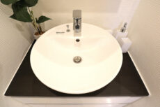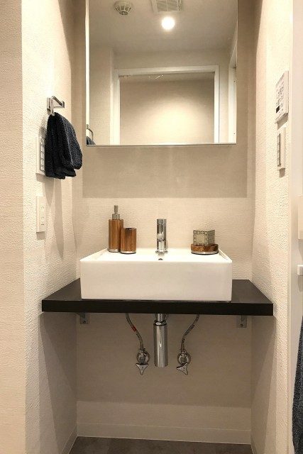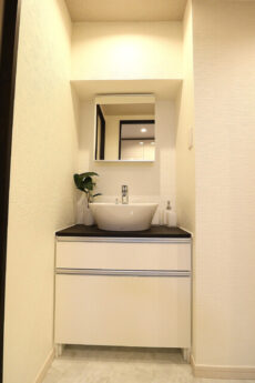 洗面台はシンプルな洗面ボウルと鏡(収納有り)の造りです。洗面台の右奥が浴室となっています。