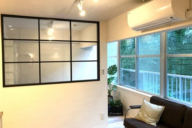 エアコンの下が出窓っぽくなっています。あのラインでパーテーション等を置いて区切れば、空間を上手に仕切ることもできそうです。