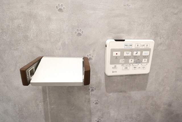 トイレはコンクリート打ちっ放し風の無機質デザインと思わせつつ、猫の足跡があります。担当デザイナーのちょっとした茶目っ気ですね。