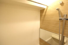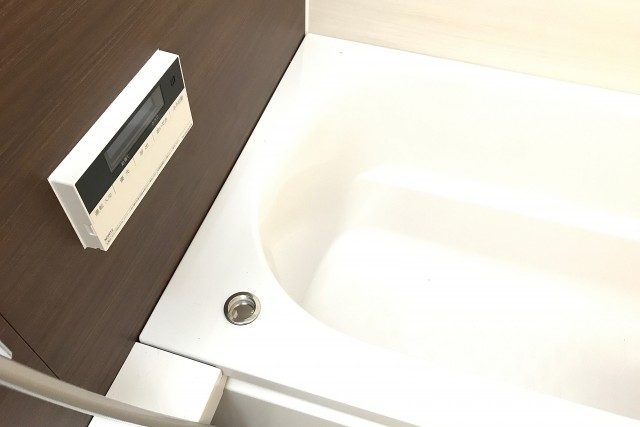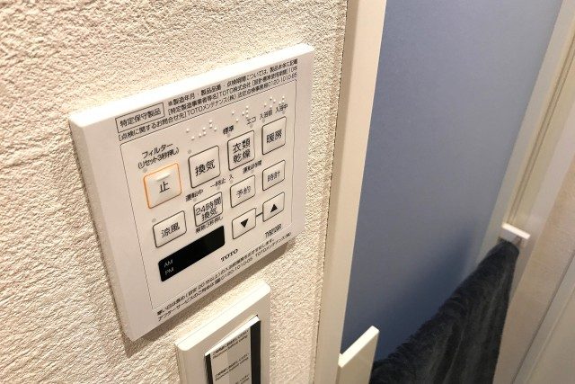 右側の壁についているのは、ユニットバスの設定パネルとモニター付きインターフォンです。追い炊き機能・浴室換気暖房乾燥機能等が付いていますよ。