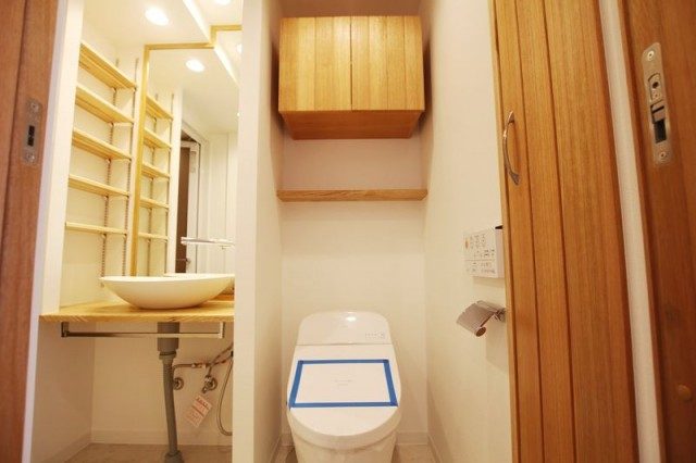 洗面スペースの横に設置されたトイレは統一感のある木材の吊戸棚が備わっており、細々としたものを片付けられます。