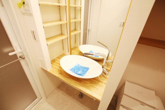 優しい木目と遊び心のある洗面台が心地の良い空間を作ります。