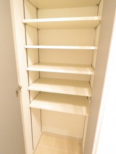キッチン横にはこんな棚付きの収納スペースも。食材のストックやキッチングッズもリビングから見えにくいところに保管しておけますね。
