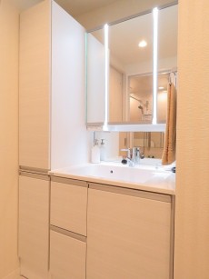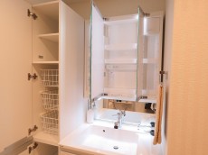 鏡の裏、引き出し、横にリネン庫付き、と洗面化粧台は収納たっぷり!