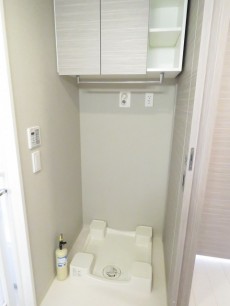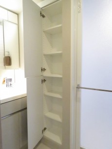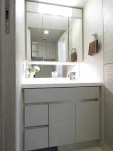 洗面化粧台は鏡の裏、引き出しなど小物の収納スペースが豊富。横に棚も設けられています。ゴチャゴチャ散らかりがちな水回りもスッキリ片付きますね♪