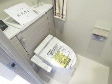 洗面室の向かい側がトイレ。手洗い場と収納棚がついています。