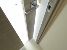 人感センサー付きの玄関ホール。人の気配にあわせて自動で照明が消灯するので消し忘れがなく経済的です。インターホンは来訪者の顔が確認できるTVモニターつき。