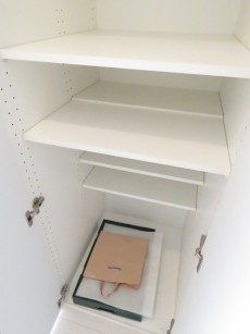 冷蔵庫置場の横には可動棚付きの収納が設置されていました。