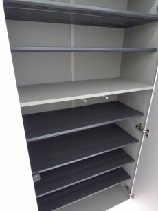リビング内には収納場所が2か所。生活感のにじみがちな日用品のストックなどは扉がついた物入れへ、見せながら収納したい物はオープンシェルフへと分けてご利用いただけます。棚の高さは入れる物にあわせて変えられます。