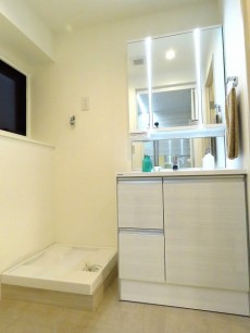 シューズBOXの向かい側は洗面室。脱衣スペースを挟むように洗濯機置場と洗面化粧台、バスルームが配置されています。