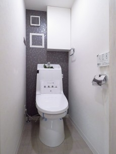 ウォシュレットとペーパーのストックや小物の収納に便利な戸棚が設置されています。