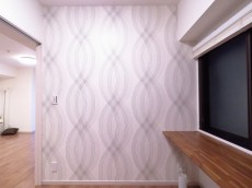 リビングダイニングスペース。壁面のアクセントクロスが目を引きます。スタイリッシュでステキです。