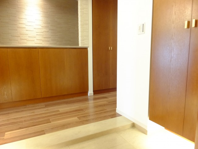 玄関に入ると、両サイドにシューズボックスがあります。入って左側のシューズボックスはカウンターになっているので、置物や植物などで、素敵な空間にしてください。