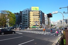 大通りにぶつかると、見えてきました!写真左上に少し東京レジデンスの上部分がのぞいています。あとは通りを渡って、少し歩けば到着します。