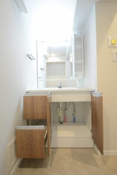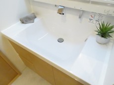 洗面化粧台は鏡の裏、引き出しと小物の収納スペースが豊富。