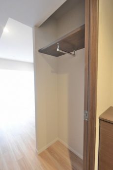 玄関先は廊下になっており、収納、LDK、洗面室の扉が廊下を囲むように配置されています。フローリングも建具も木目調であたたかみのある雰囲気です。