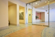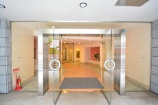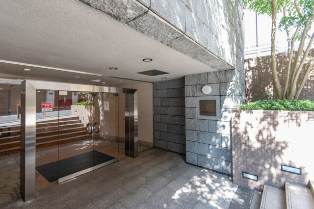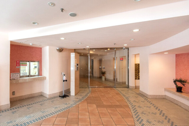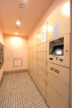 左には管理室で、安心のオートロック。宅配ボックス完備。