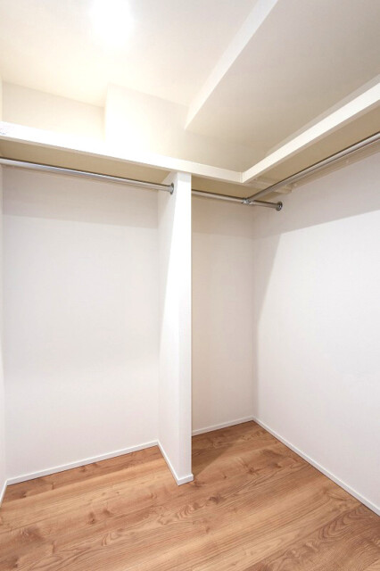 左側は約1.0帖のウォークインクローゼット。L字にハンガーパイプが付いています。