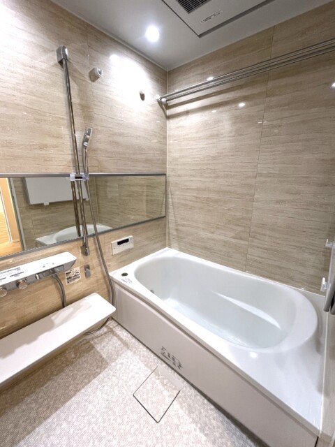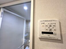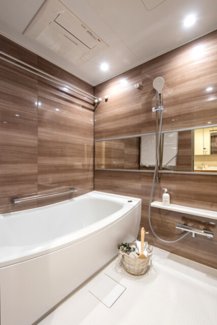 浴室はTOTO製追い焚き機能付きユニットバス。ダークブラウンのパネルで落ち着いた雰囲気です。浴室換気乾燥機付きで、雨の多い時期のお洗濯も安心ですよ。