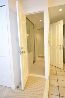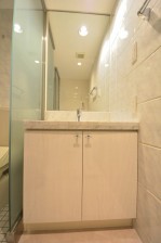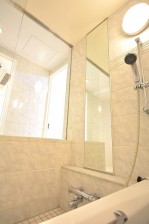 手洗いカウンター付の広々としたトイレで、私なんかは広すぎて落ち着かないんじゃないかと心配になるくらいです(笑)TOTO製タンクレストイレで、トイレットペーパーのストックなどに便利な吊戸棚や、洗浄便座も完備しています。