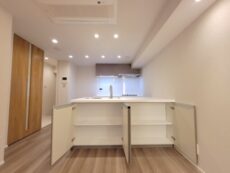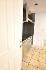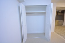 玄関に向かって左にセットしてあるクローゼット、こちらも大容量なので物が多い方でも安心です。厨房機器はシルバーで洗練された感じです。