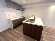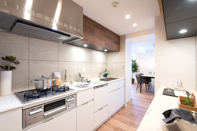 キッチンはシンク部分とコンロ部分が分かれたⅡ型。広い作業スペースと動線の短さが特徴のキッチンです。