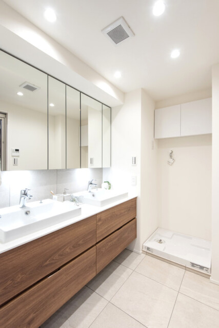 キッチンと同じ田中工藝製の洗面台は2ボウル!!! 朝のラッシュ時にも安心です。三面鏡も2セットってすごいですね。
